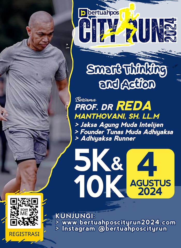 Tak kalah menarik, Bertuahpos City Run 2024 akan menghadirkan tamu istimewa yakni Prof. Dr. Reda Manthovani, SH. LLM, Founder Tunas Muda Adhiyaksa – Adhiyaksa Runner yang juga Jaksa Agung Muda Intelijen (Jamintel). “Alhamdulillah secara khusus beliau sudah mengonfirmasi kehadirannya untuk ikut dalam ajang ini. InsyaAllah. Sosok beliau dikenal luas dalam olahraga atlet. Apalagi beliau juga dipercaya pemerintah sebagai Chef de Mission (CdM) Kontingen Indonesia untuk Paralimpiade 2024 Paris. Ini akan semakin memotivasi kita semua,” ungkap Melba.